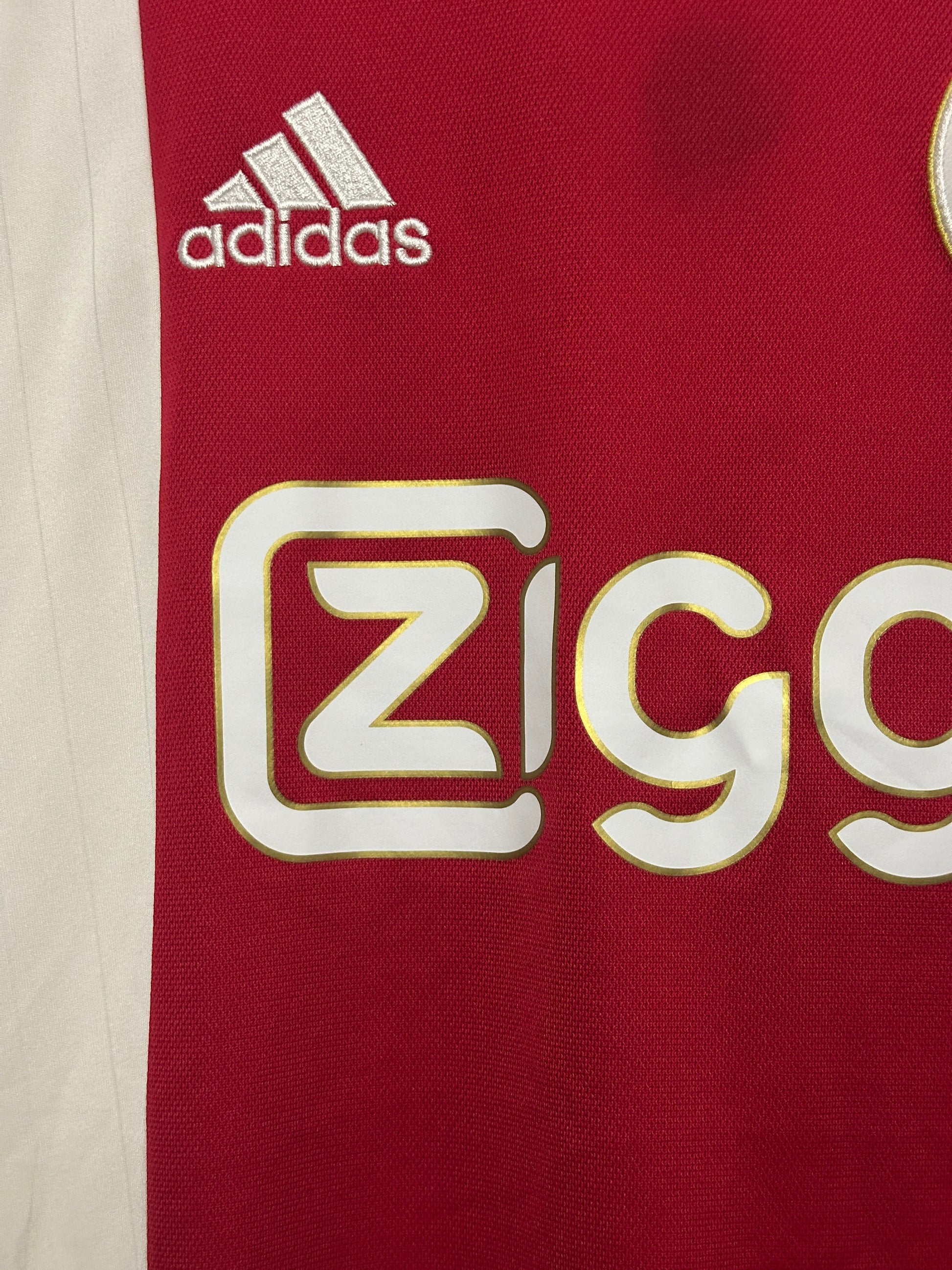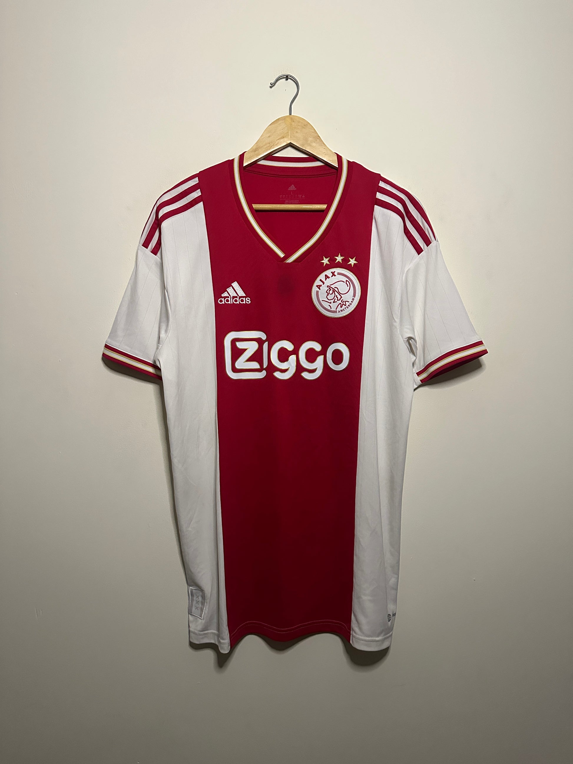 AFC Ajax's iconic 2022-23 home shirt captures the essence of Dutch football excellence. This authentic Adidas jersey features the club's classic red and white design with premium construction and breathable fabric for superior comfort. In very good condition with only a minor mark to the front, it's an exceptional find for collectors and supporters alike. Whether you're displaying your passion for Ajax or adding to your vintage football shirt collection, this piece represents a pivotal season for one of Europe's most storied clubs. A genuine piece of football heritage at an unbeatable value.