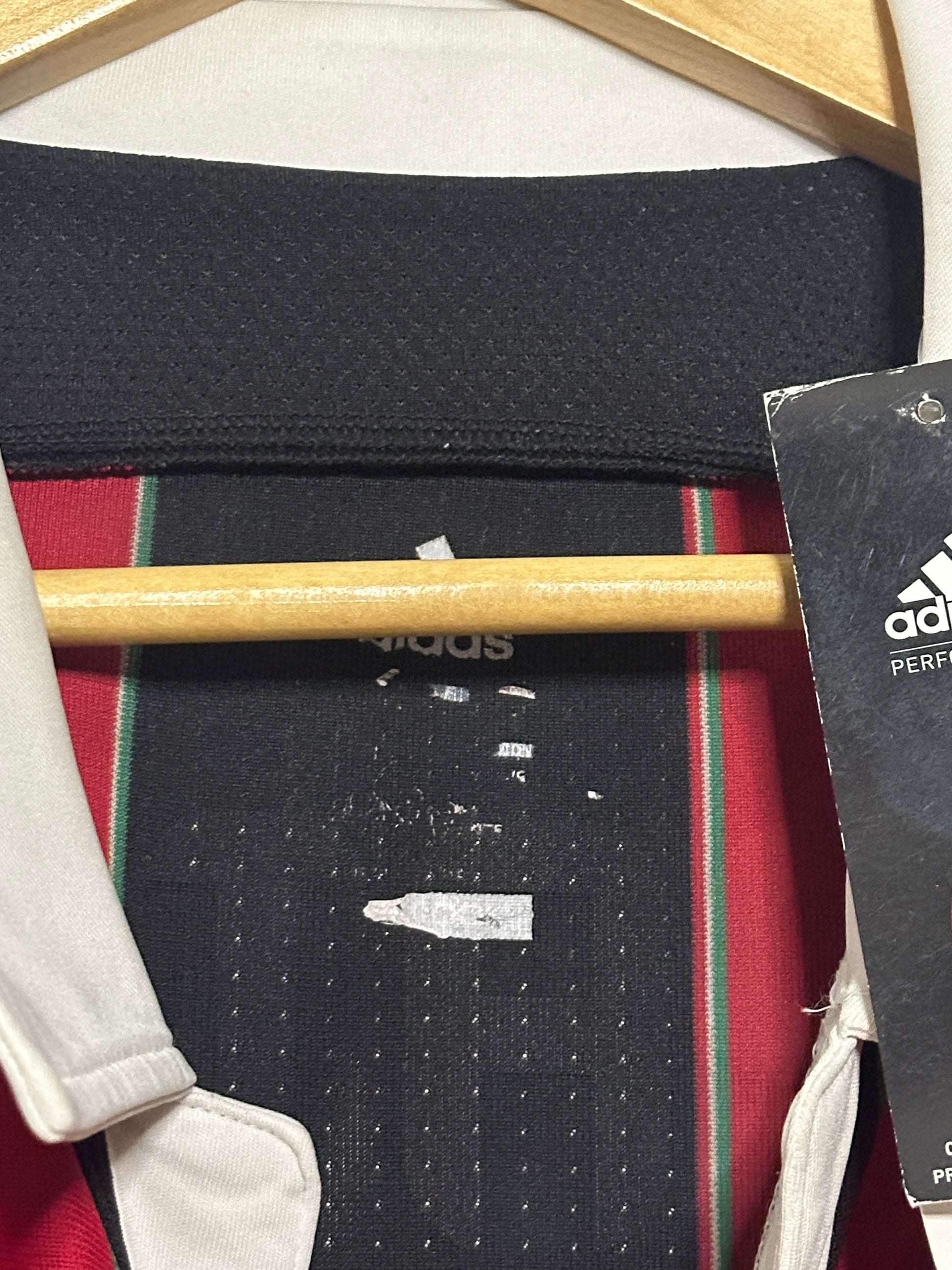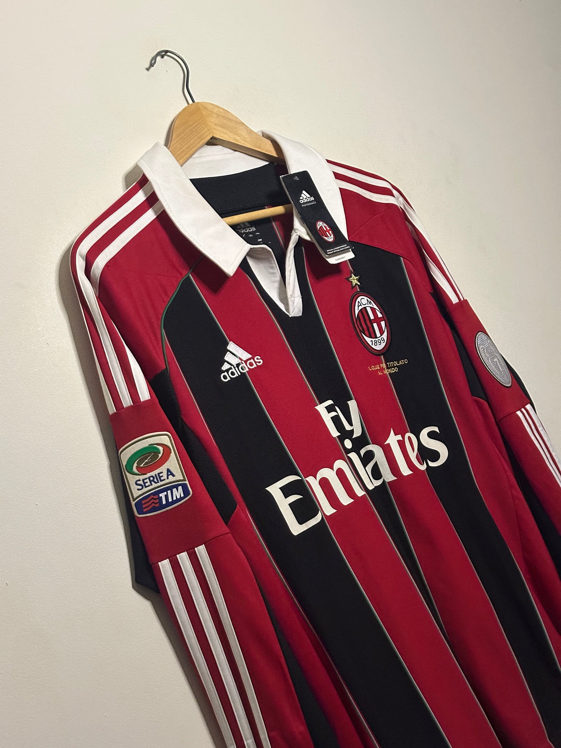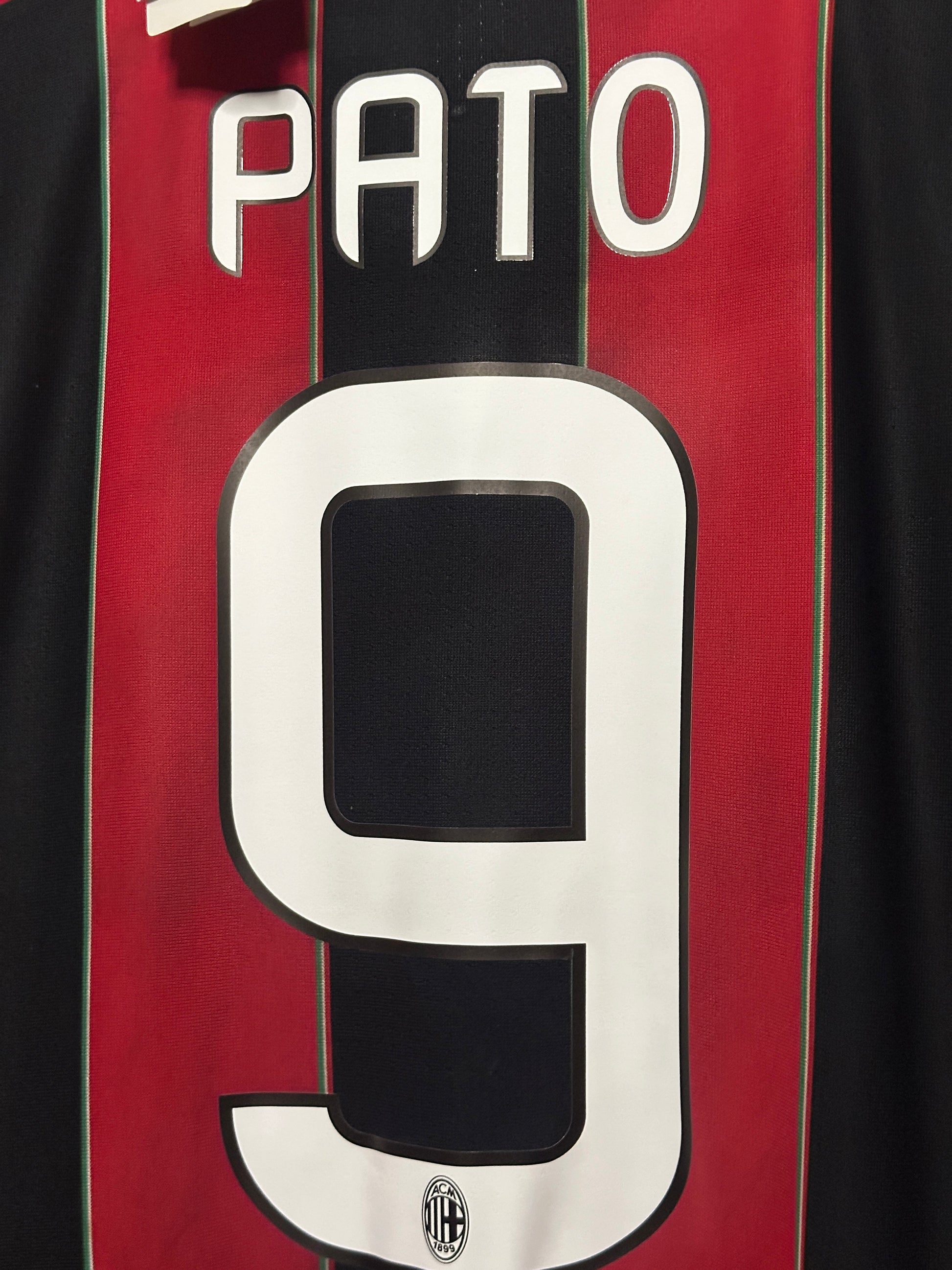 This Alexandre Pato AC Milan 2012-13 long sleeve home football shirt in size L is a rare, brand-new item with tags. The original name has been replaced due to damage, with only minimal marks remaining from the removal process. Please note some cracking on the sponsor’s logo, consistent with the shirt’s age and storage, making it a unique collector’s piece for dedicated fans and memorabilia enthusiasts.