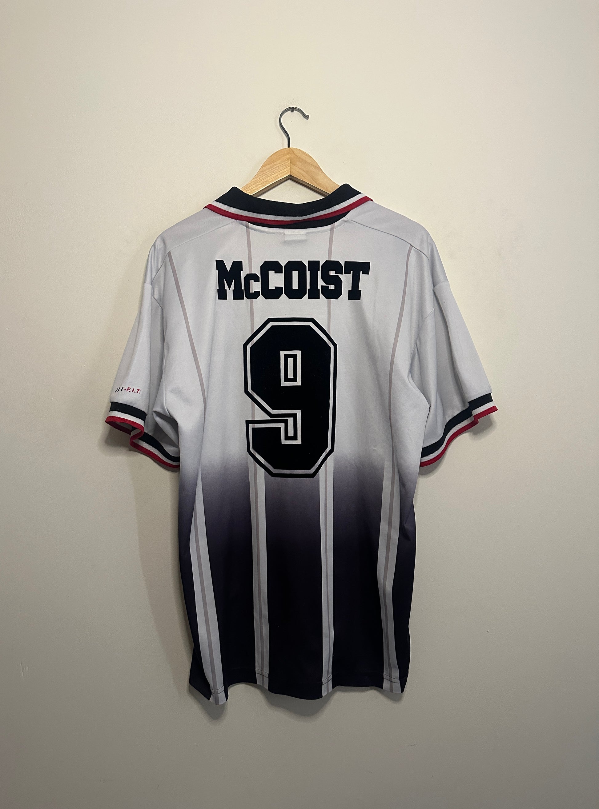 This authentic Rangers FC away and third shirt from the 1997-98 and 1998-99 seasons features the iconic number 9 worn by Ally McCoist. In good condition and size XL, it’s a prized piece for collectors and fans, capturing a memorable era of Rangers football history.