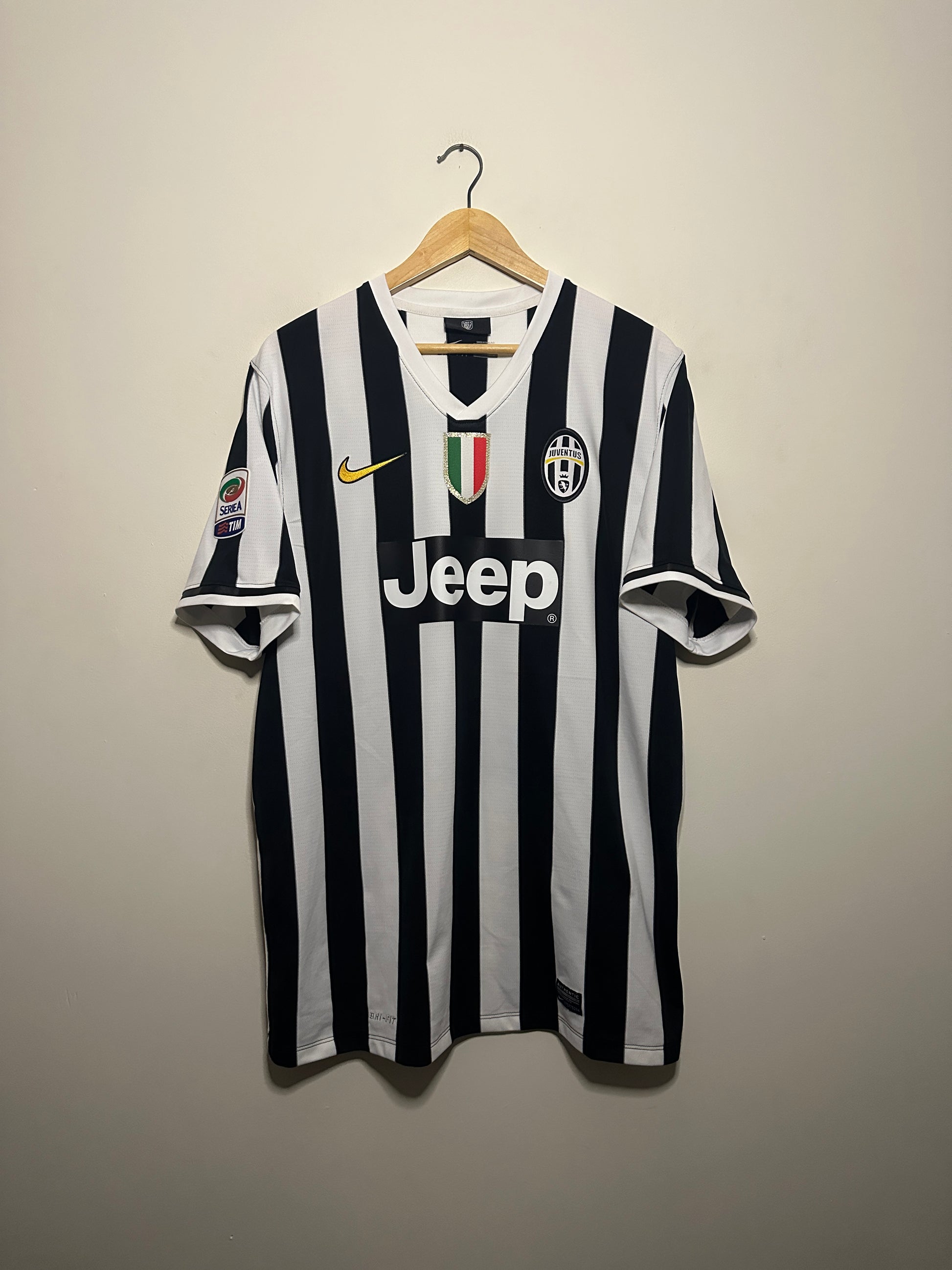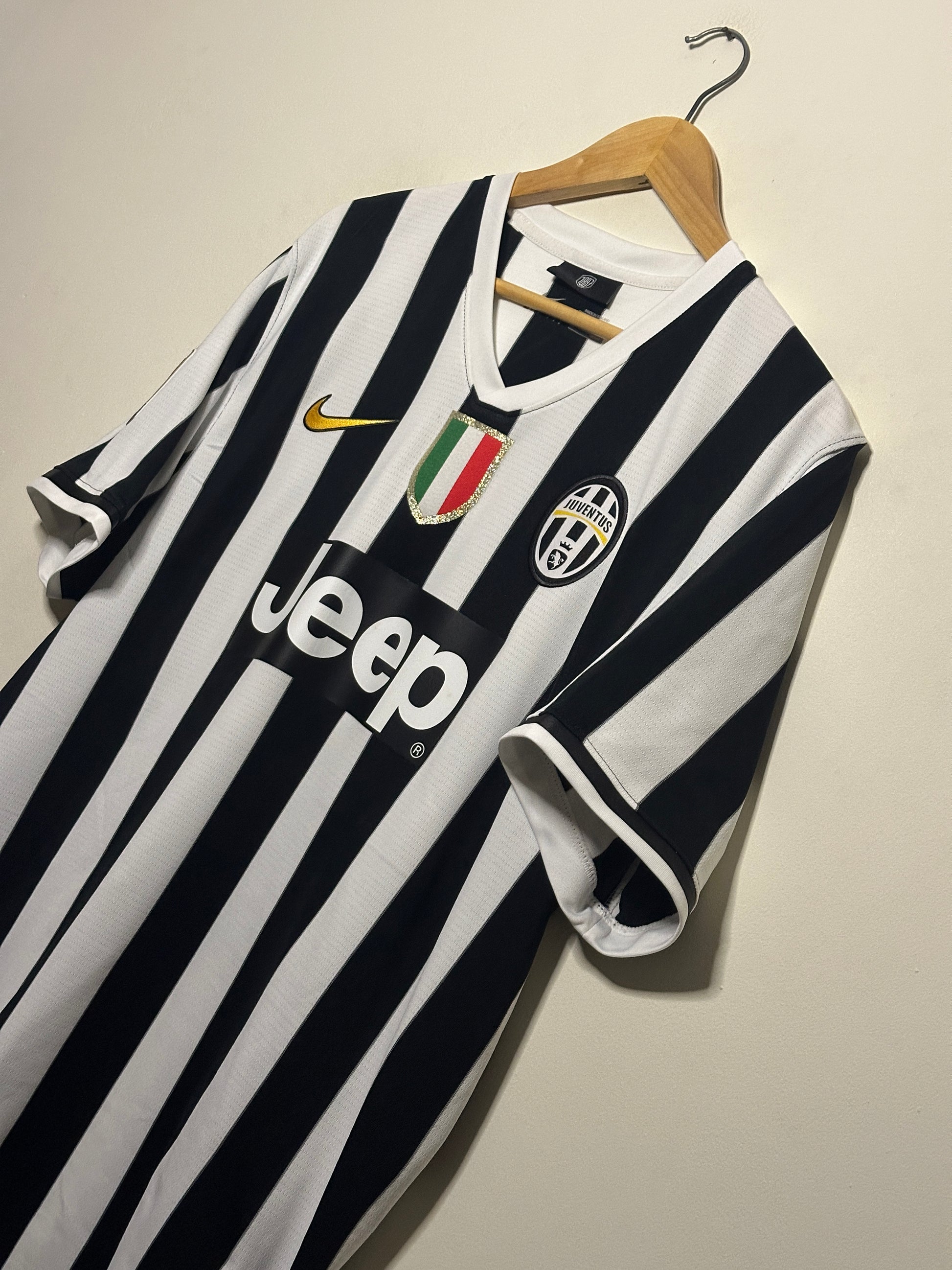 This Andrea Pirlo Juventus FC 2013-14 home football shirt in XL is preserved in excellent condition, featuring the Serie A patch and Scudetto badge from their title-winning season. It represents a key piece of football history, perfect for collectors seeking genuine memorabilia that highlights Pirlo's iconic role in Juventus’ success.