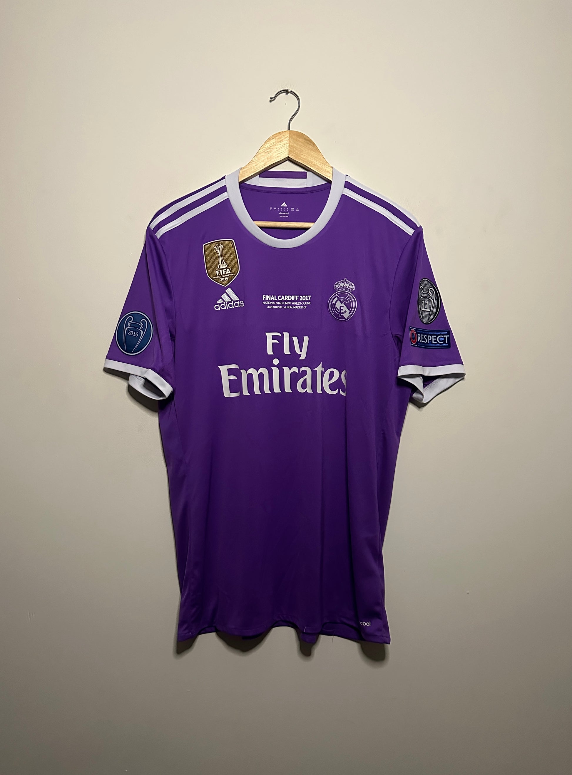 Own a piece of football history with this authentic Cristiano Ronaldo Real Madrid away shirt from the legendary 2016-17 season. Crafted by Adidas, this exceptional jersey commemorates the club's Champions League triumph. In excellent condition, it's a must-have for collectors and devoted fans alike. Featuring the iconic away kit design worn during one of Real Madrid's most glorious campaigns, this shirt captures a defining moment in football. Perfect for display or wear, it's a timeless tribute to one of the sport's greatest players and his most triumphant era.