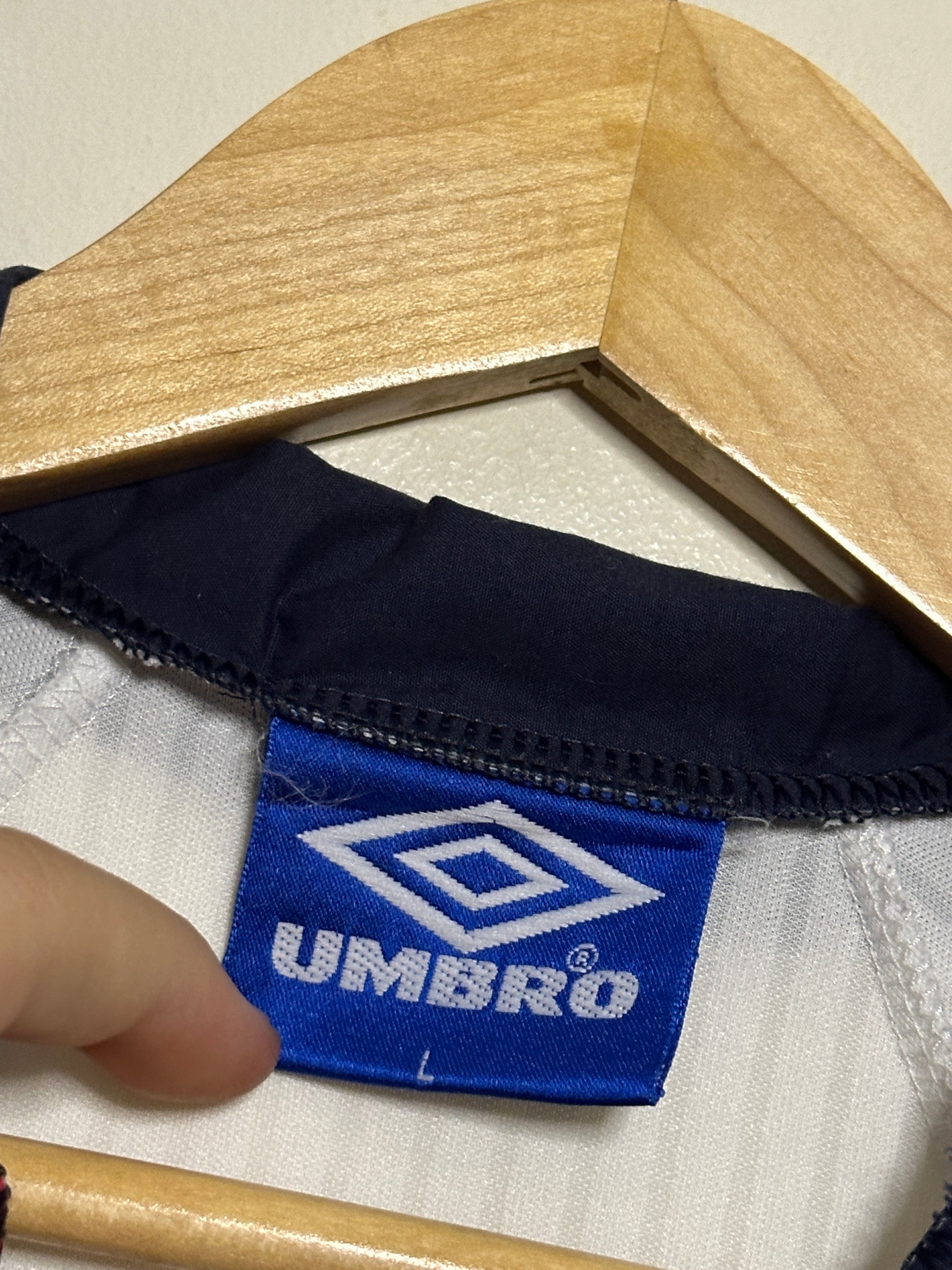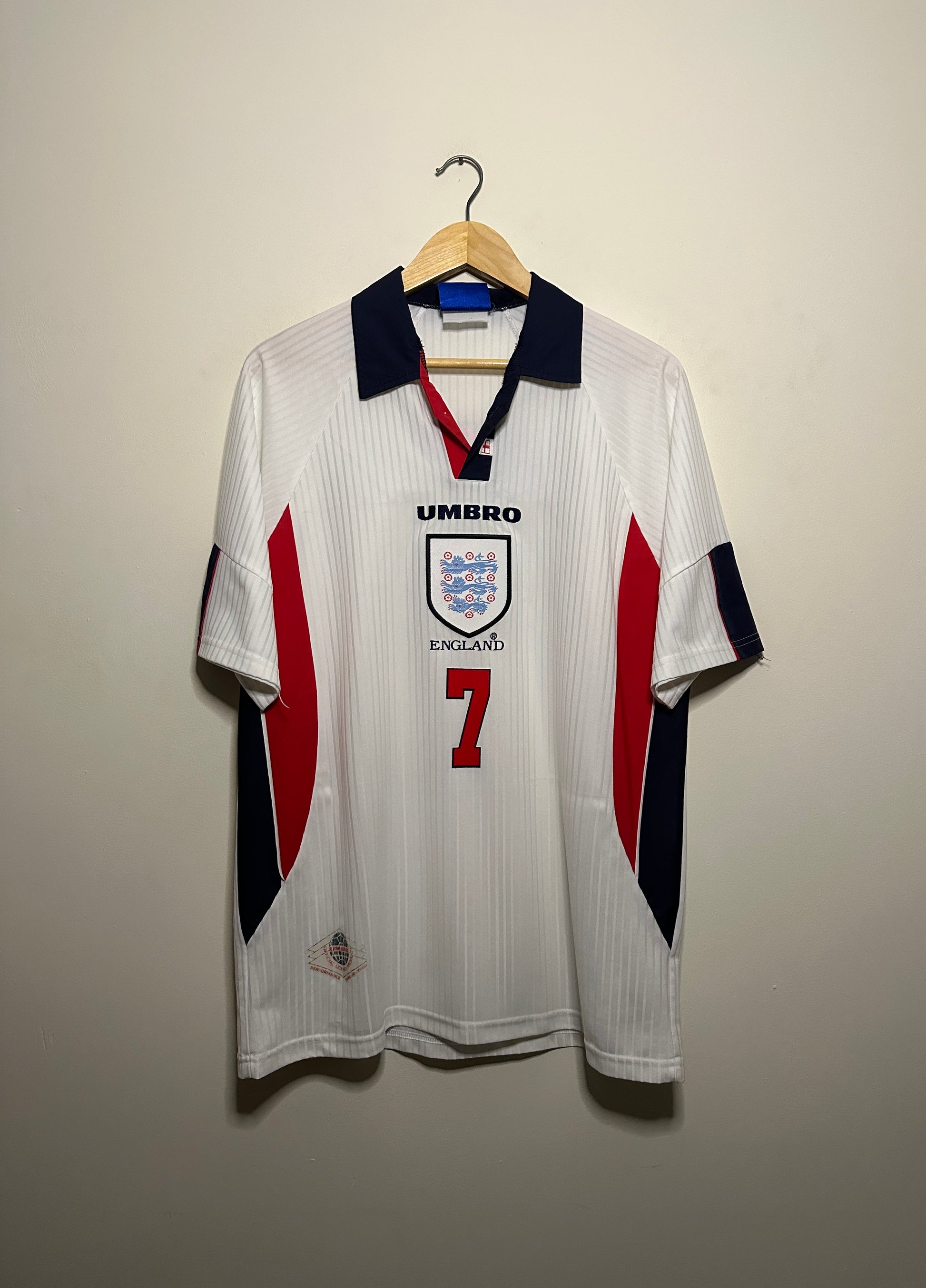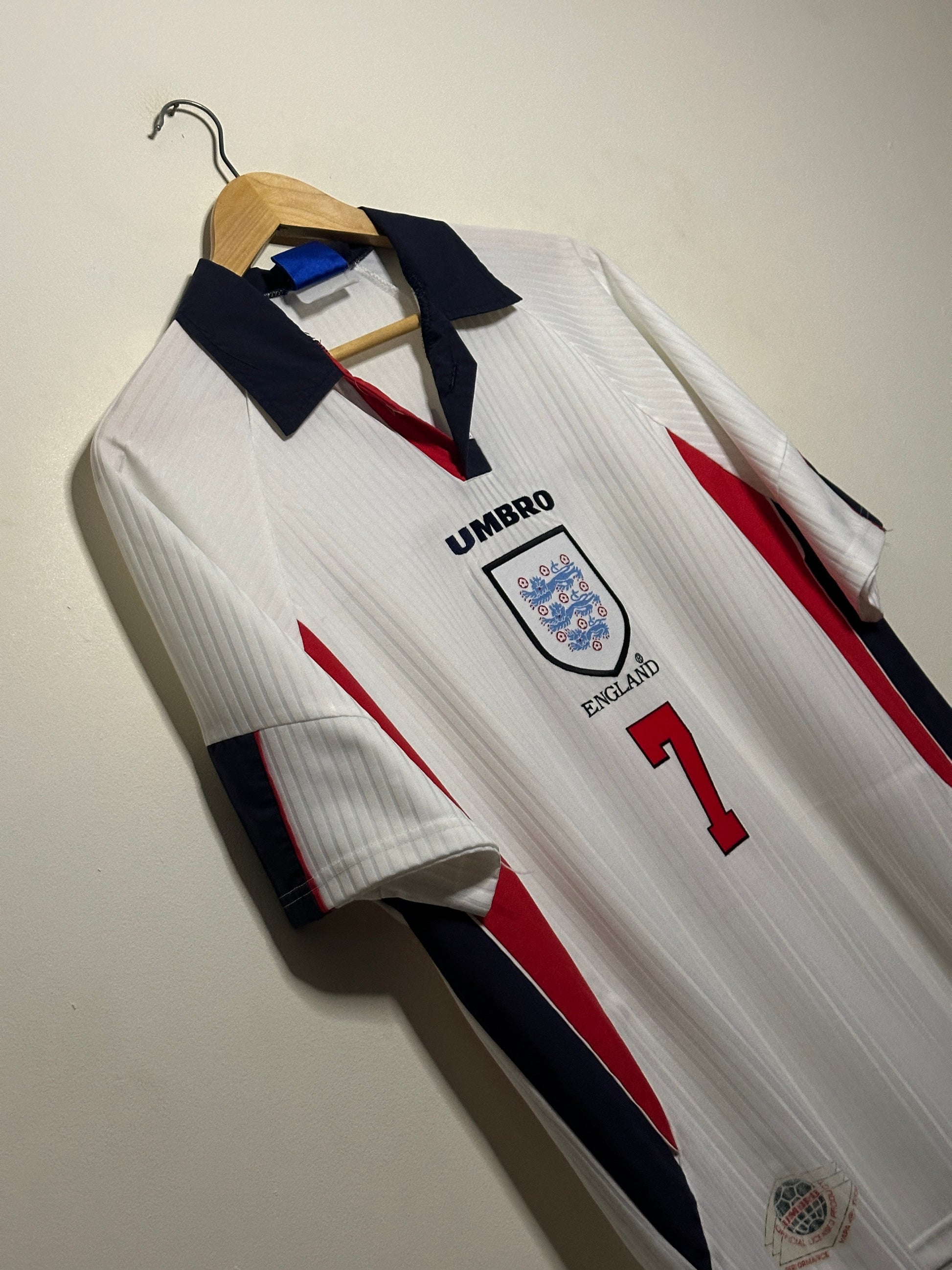 This David Beckham England 1998 World Cup home football shirt in size L is a prized collector’s item, preserved in excellent condition. Featuring authentic design details from the iconic tournament, it reflects a pivotal moment in football history. Ideal for enthusiasts and collectors, this shirt offers a tangible connection to Beckham’s early international career and England’s memorable World Cup campaign.