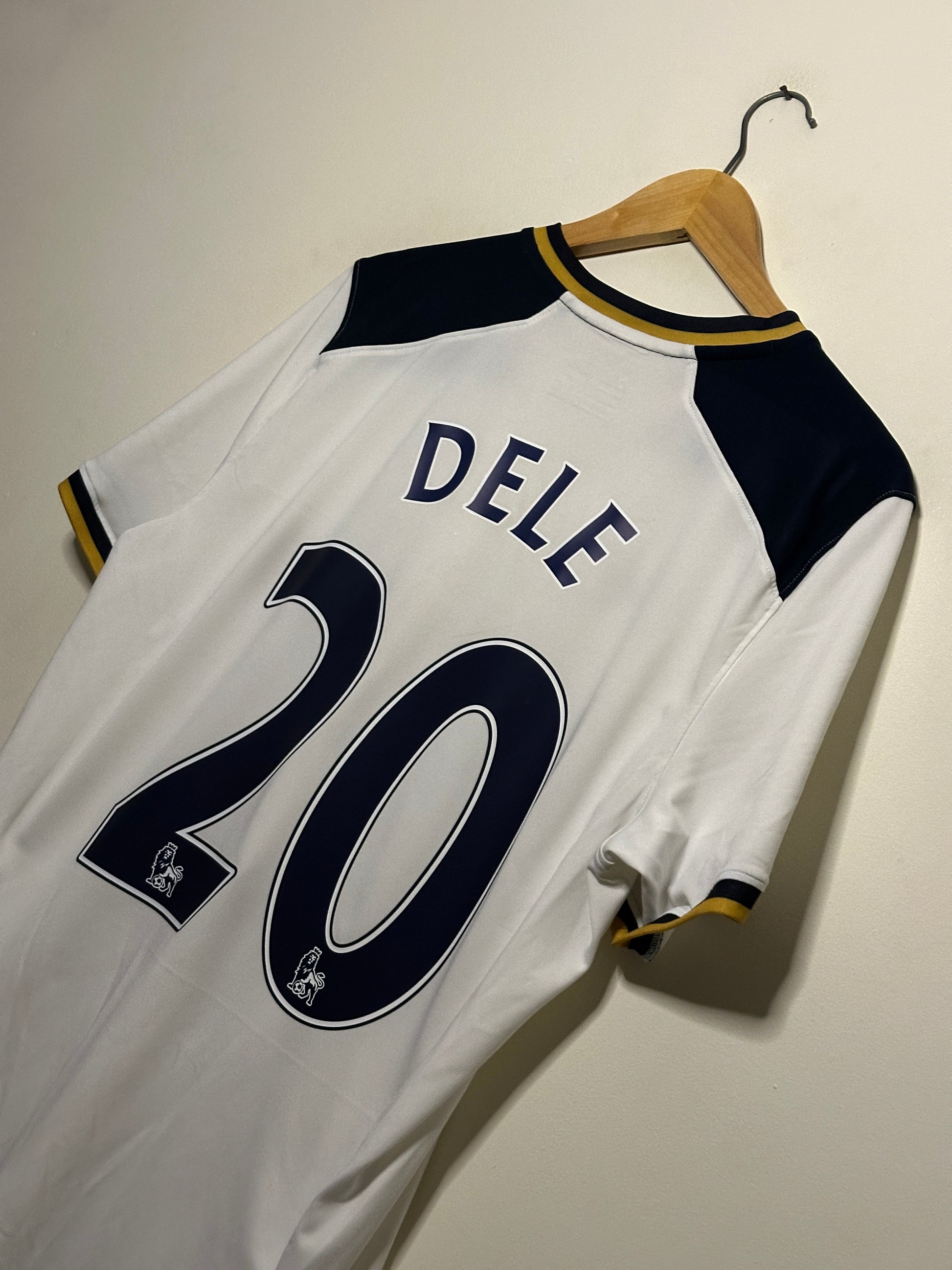 This Dele Alli Tottenham Hotspur home football shirt from the 2014-15 season is in very good condition, reflecting careful wear and preservation. Sized medium, it offers a comfortable fit for fans and collectors alike. Featuring authentic design details from that memorable campaign, this shirt is ideal for showcasing support or enhancing a football memorabilia collection with a piece linked to a rising star’s early career.