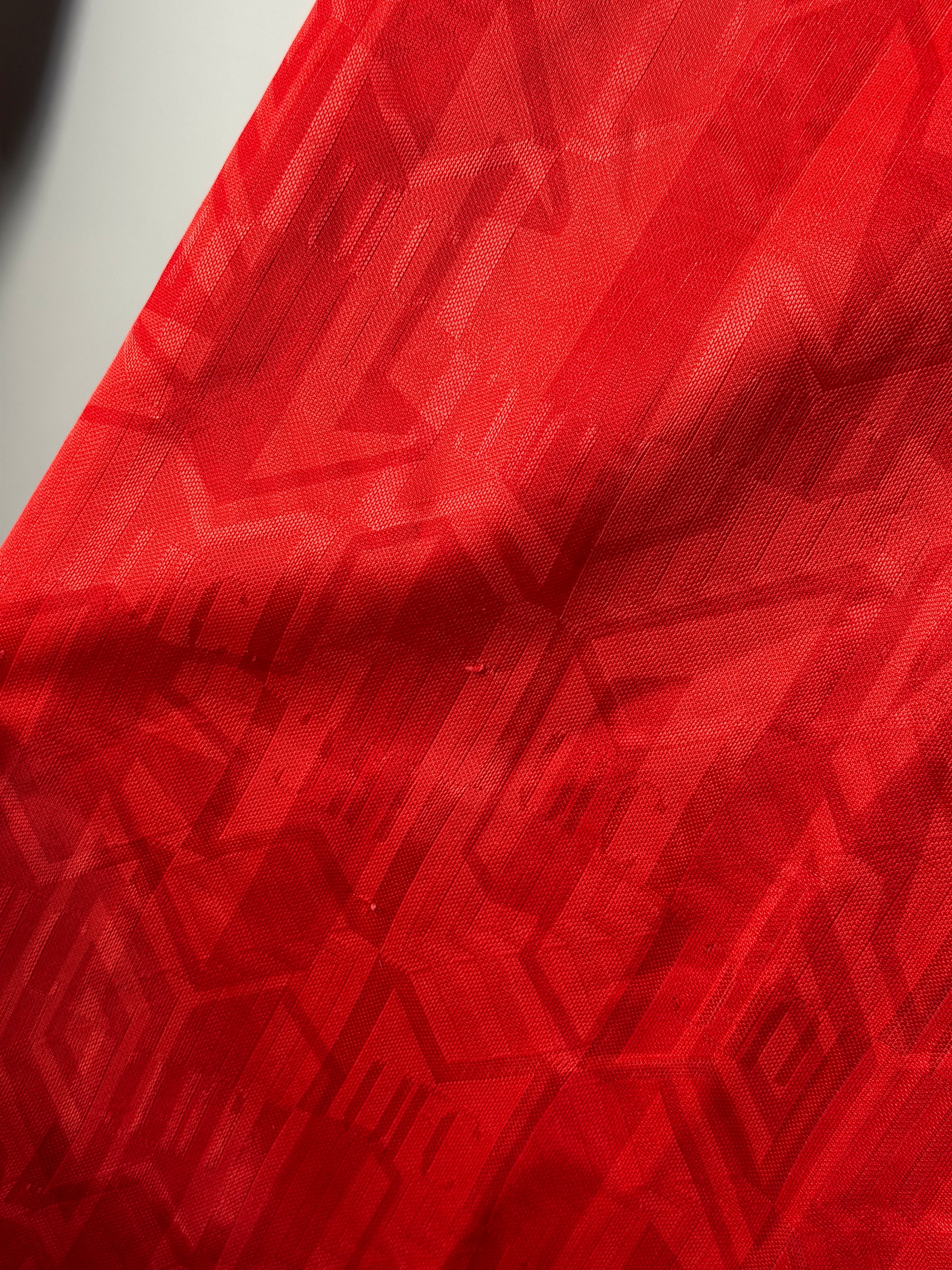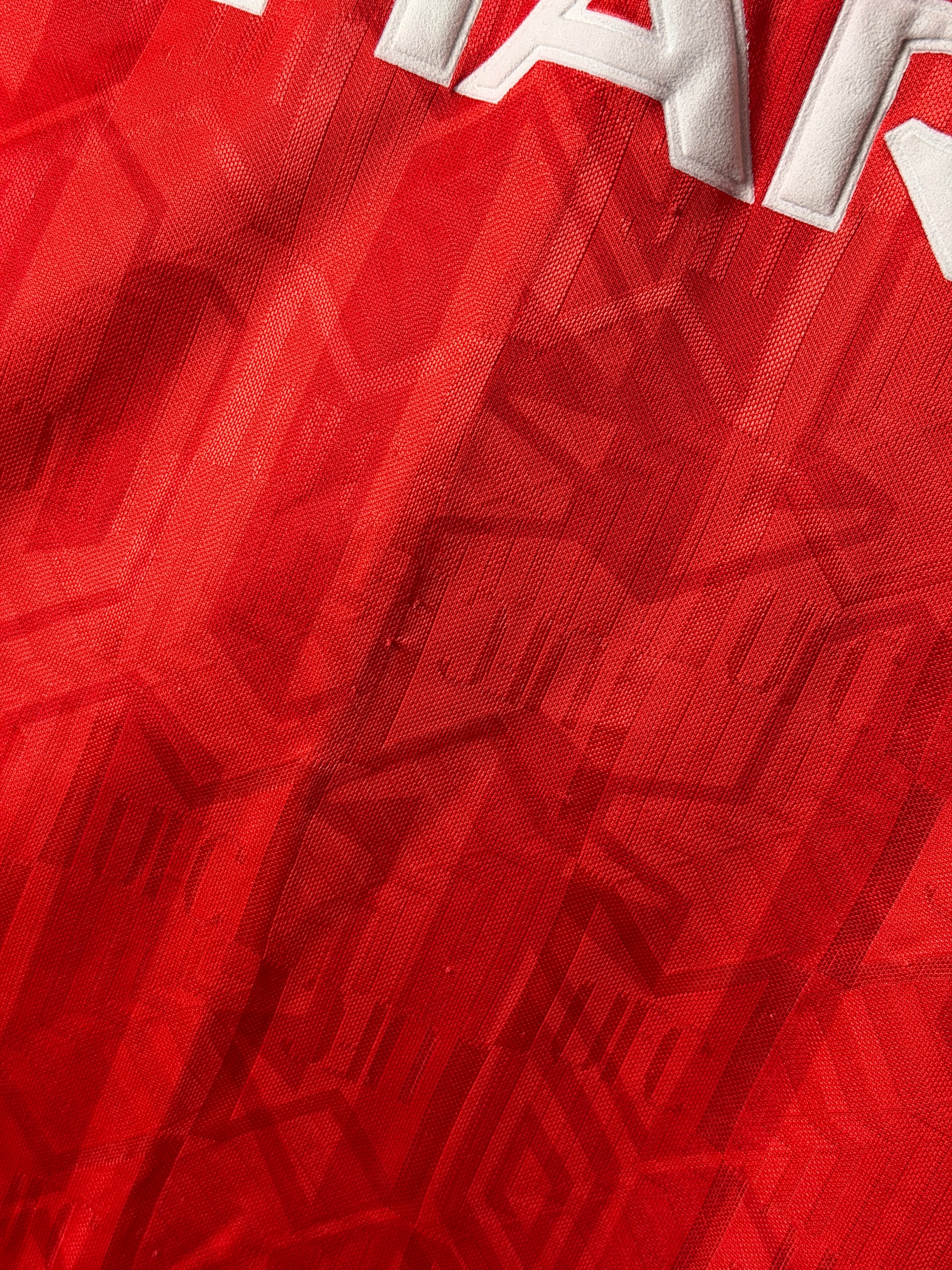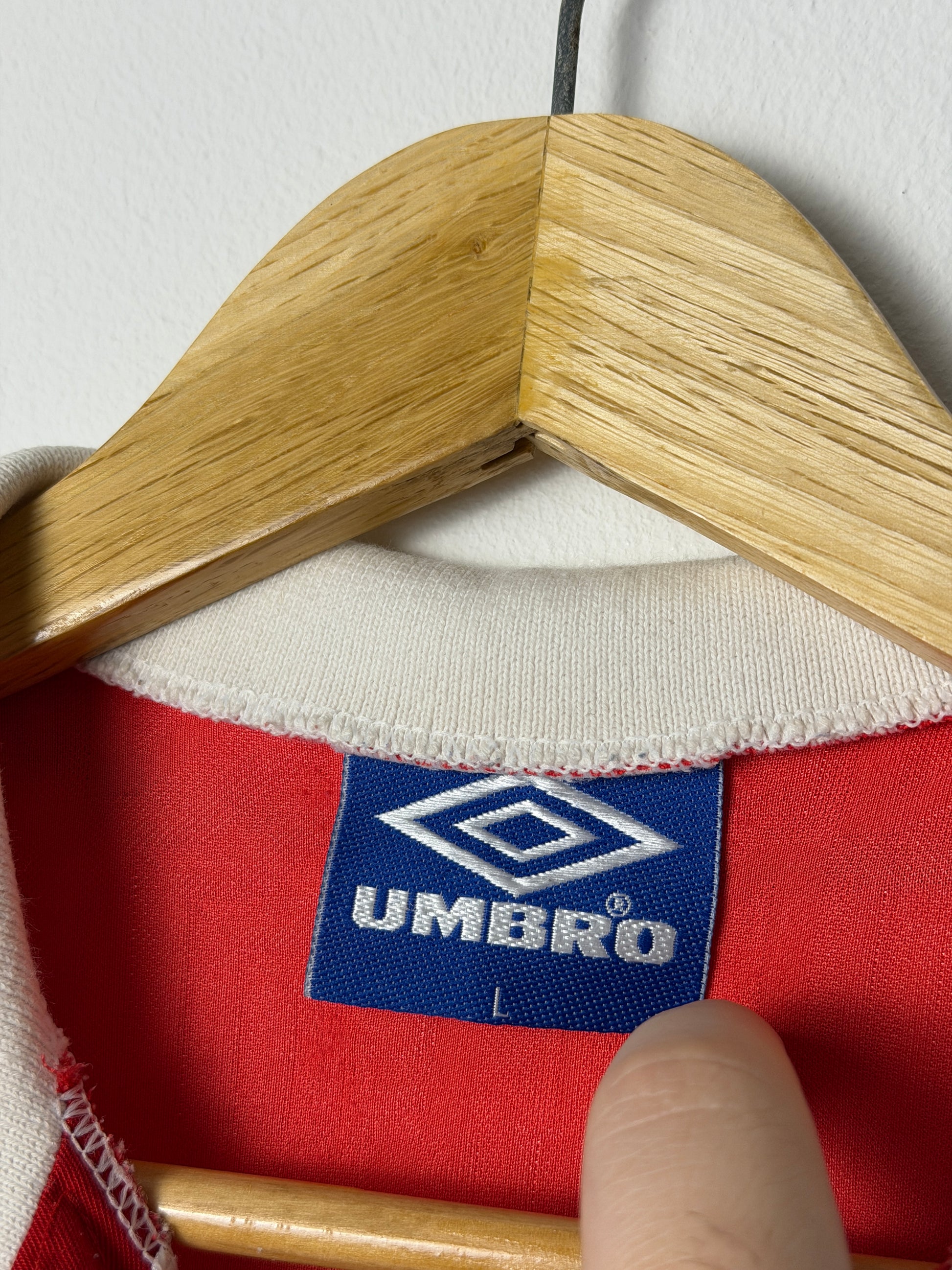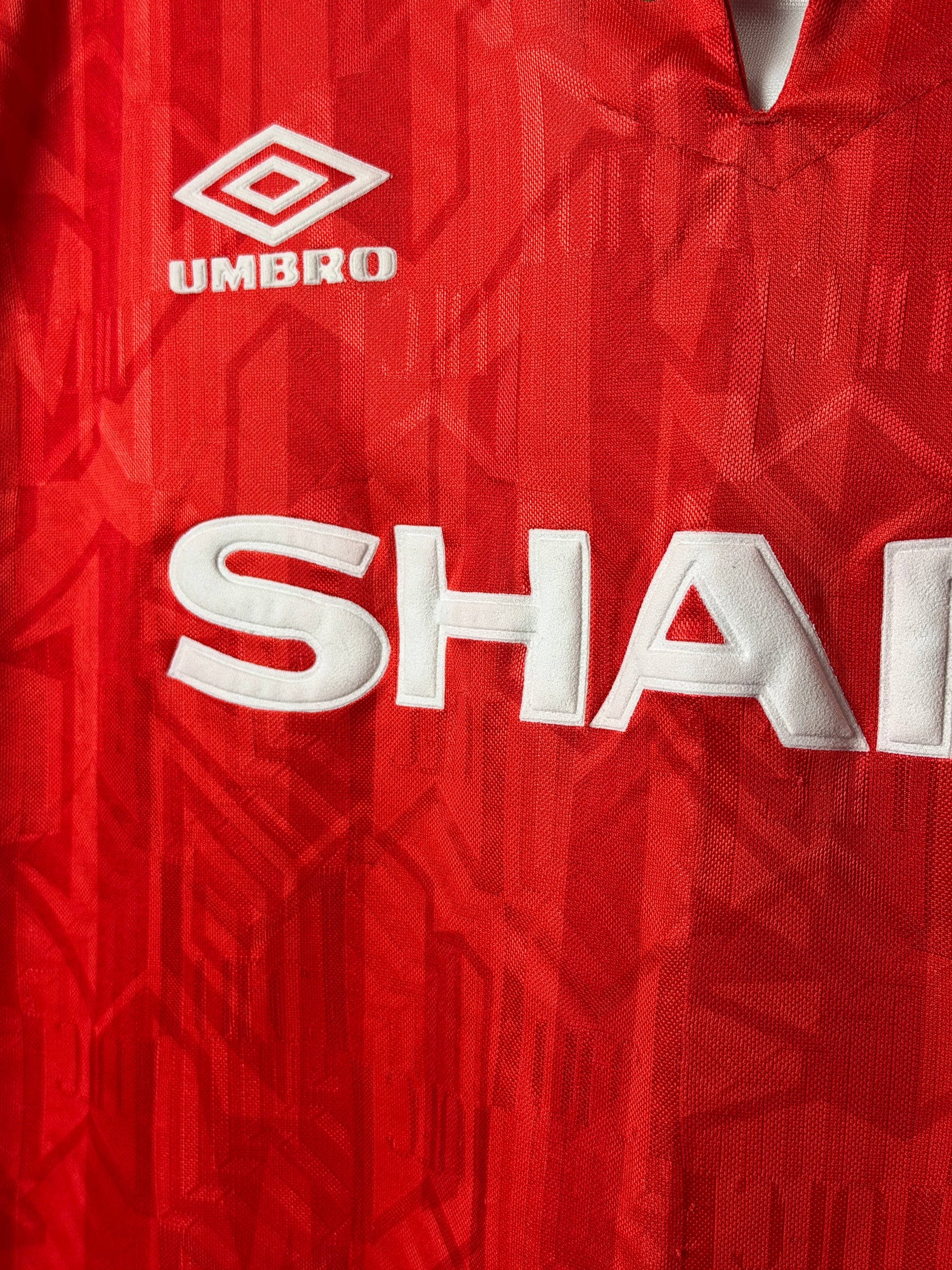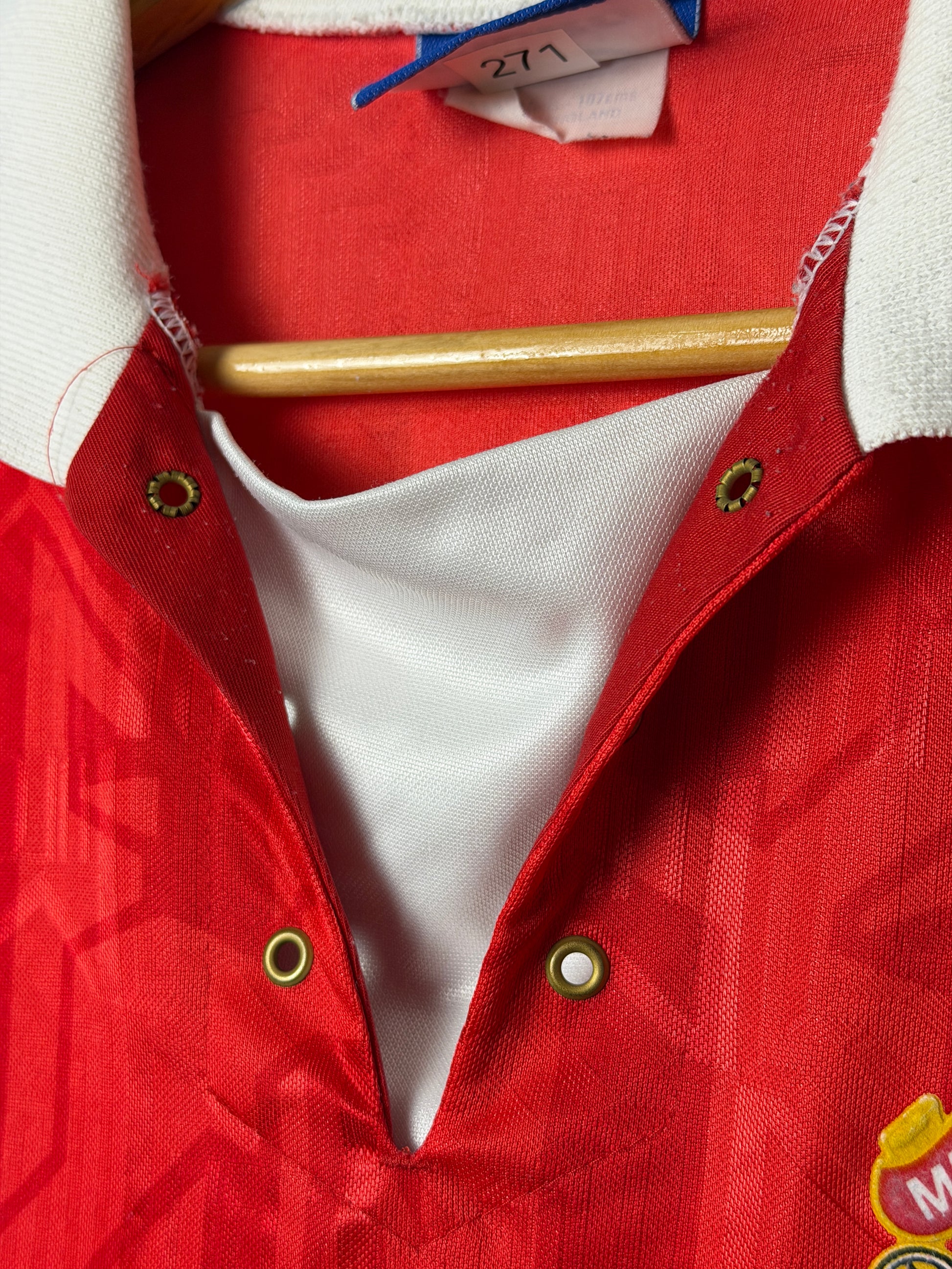 This iconic Manchester United home shirt from the legendary 1992-94 era captures a defining period in the club's history. Crafted by Umbro, it features the classic design that became synonymous with one of football's greatest eras. In very good condition with only minor plucking as shown, this vintage piece retains its character and authenticity. A must-have for collectors and United supporters who appreciate genuine football heritage. Size L.