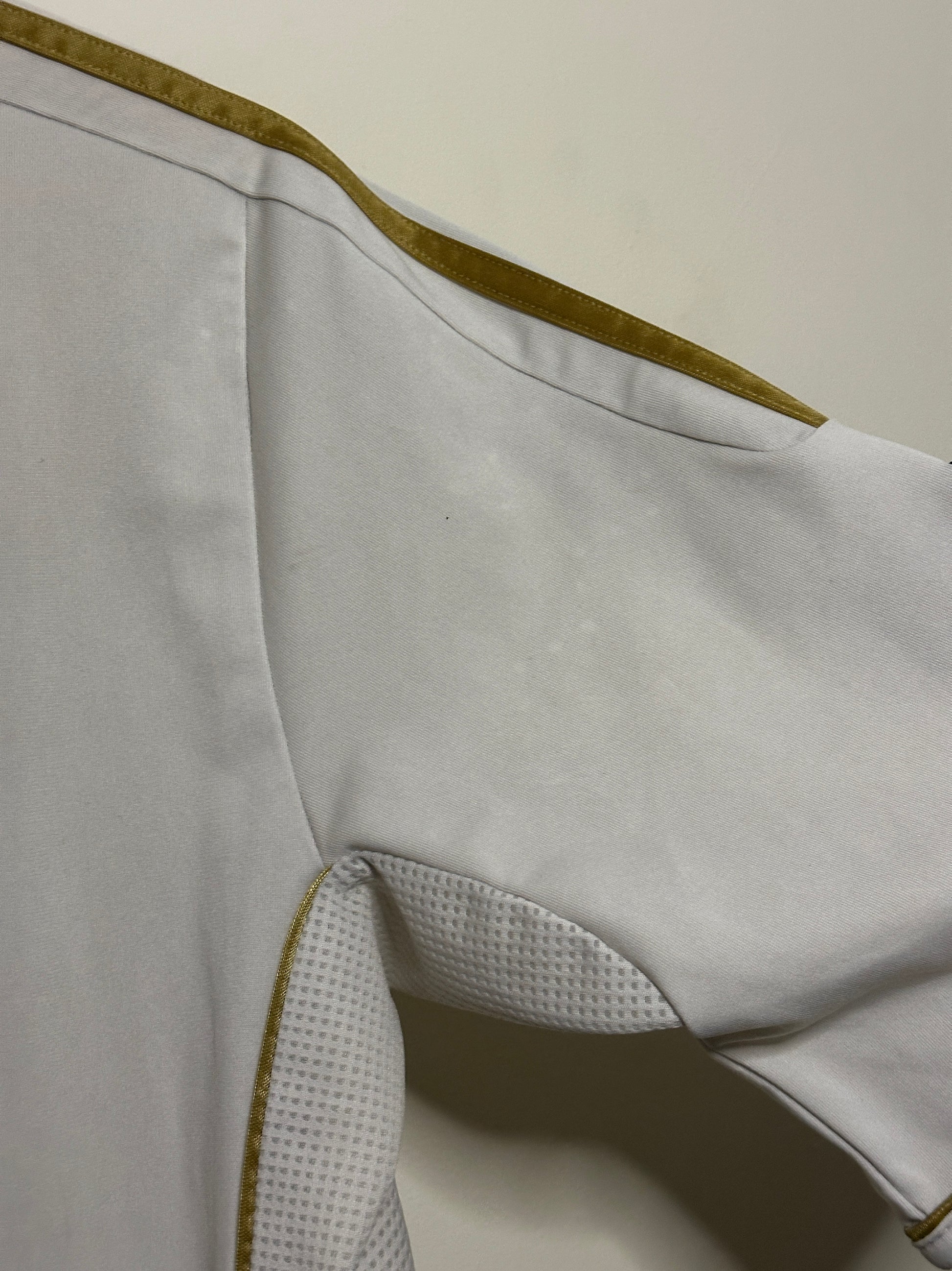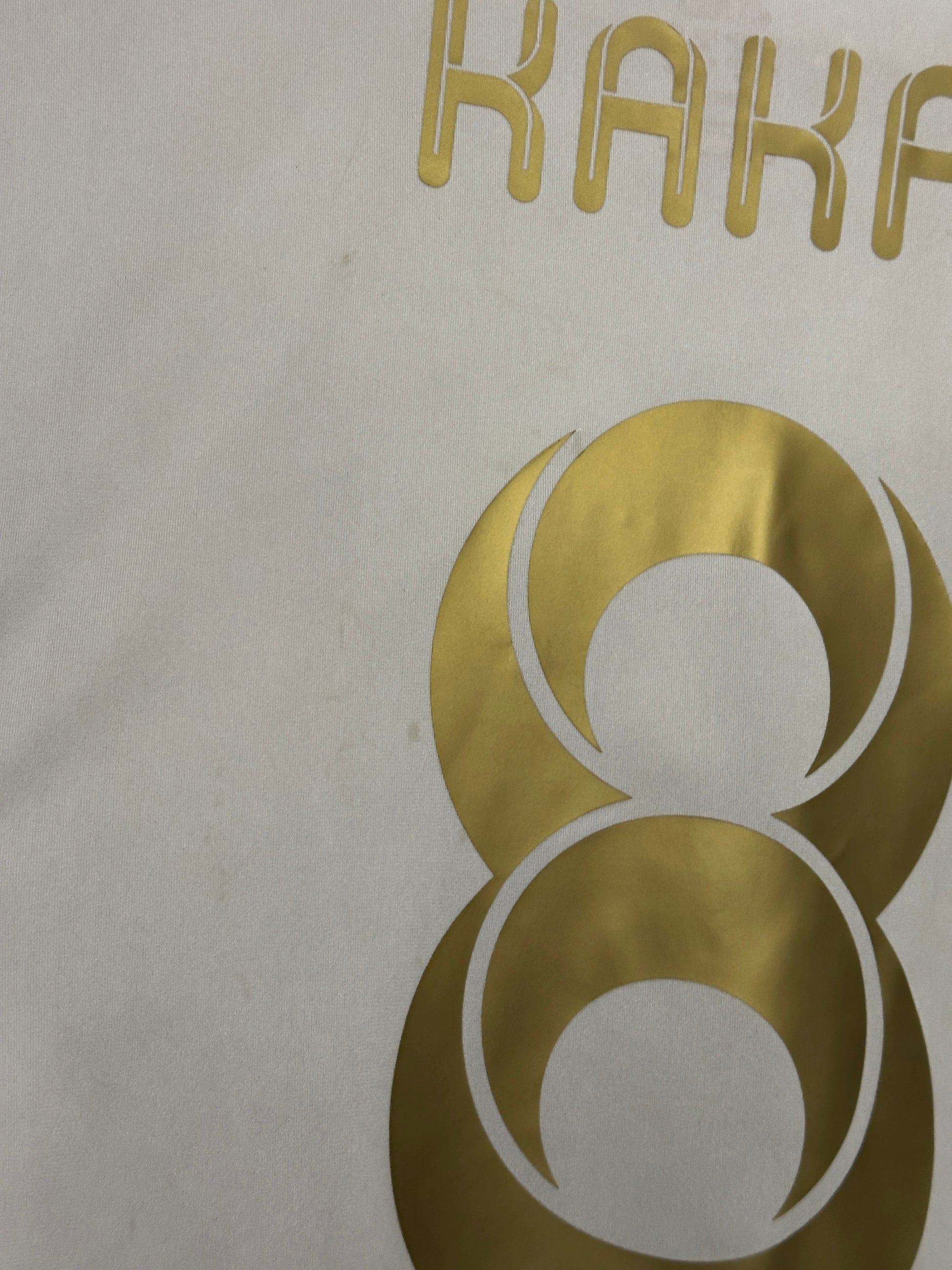Authentic Adidas Real Madrid home shirt from the iconic 2011-12 season, featuring Kaka's number. This medium-sized piece of football history showcases the classic white design that defined Los Blancos during their golden era. In good condition with natural greying and discolouration consistent with age and wear, it bears the character of a genuinely worn vintage garment rather than a pristine replica. Perfect for collectors seeking authentic matchday memorabilia or devoted Madrid supporters wanting to own a piece of the club's storied past. A rare find for any serious football shirt enthusiast.