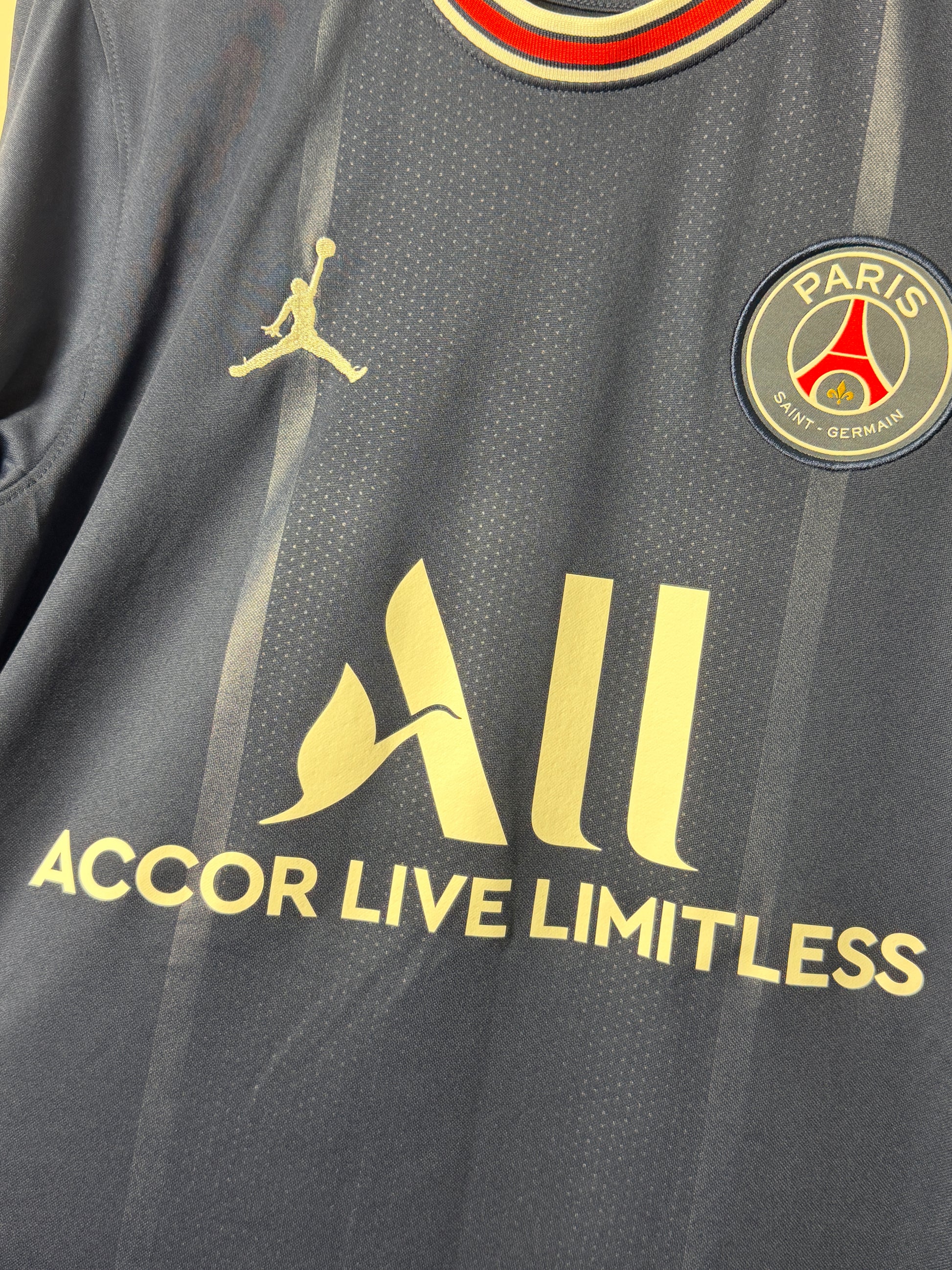 Authentic Kylian Mbappe PSG 2021-22 home shirt in size small, crafted by Jordan. This iconic jersey captures a pivotal season for one of football's brightest talents. Presented in excellent condition, it's a must-have for collectors and PSG supporters alike. Own a piece of football history from a legendary campaign.