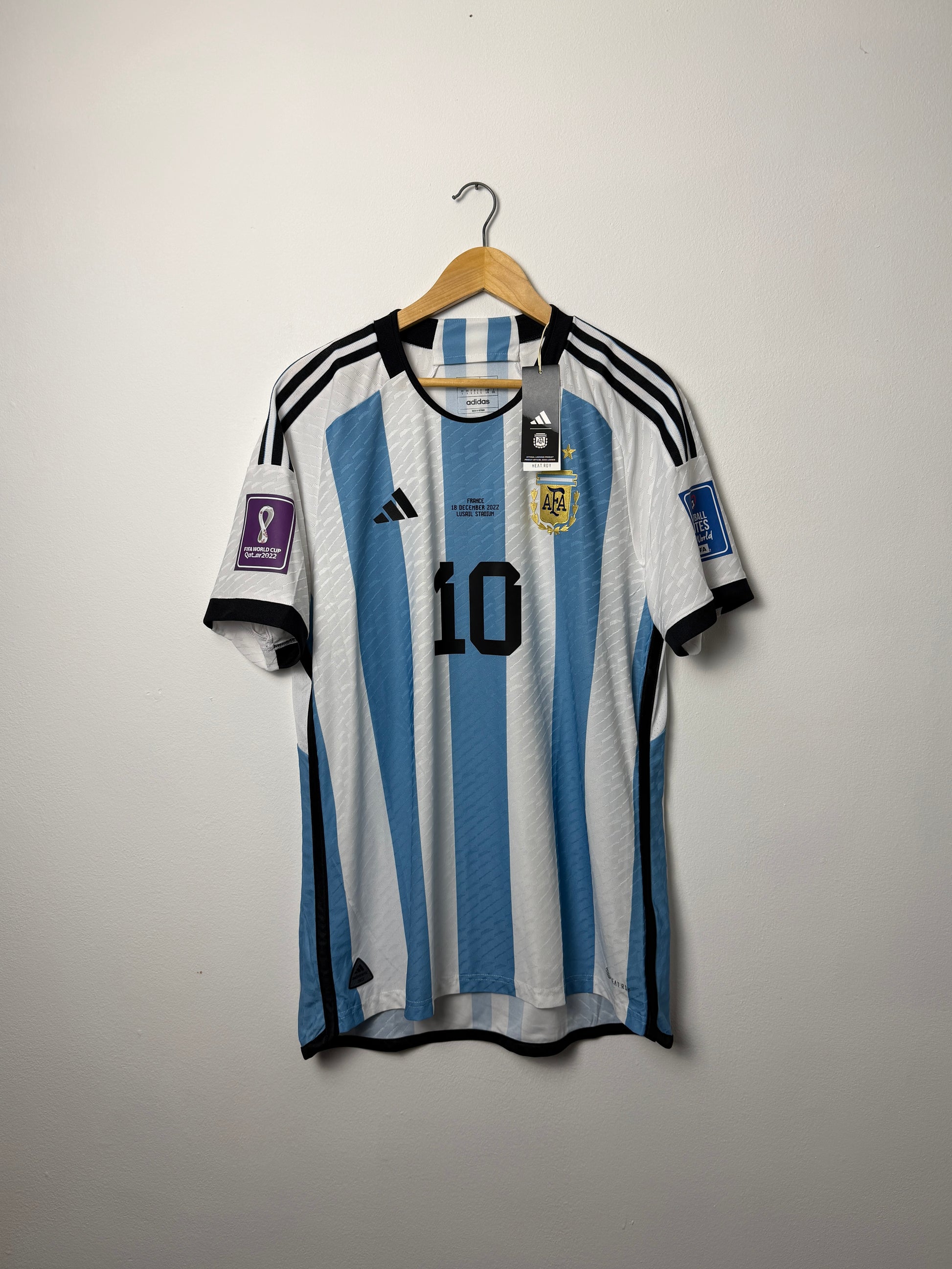 Brand new with tags, this is the authentic Argentina 2022 World Cup final edition home shirt worn during their historic triumph. Featuring Heat.RDY technology for superior moisture management and comfort, this iconic Messi jersey captures a legendary moment in football history. Perfect for collectors and passionate fans alike, it's a timeless piece celebrating Argentina's greatest achievement. Size L. A genuine piece of sporting memorabilia that only grows in significance with time.