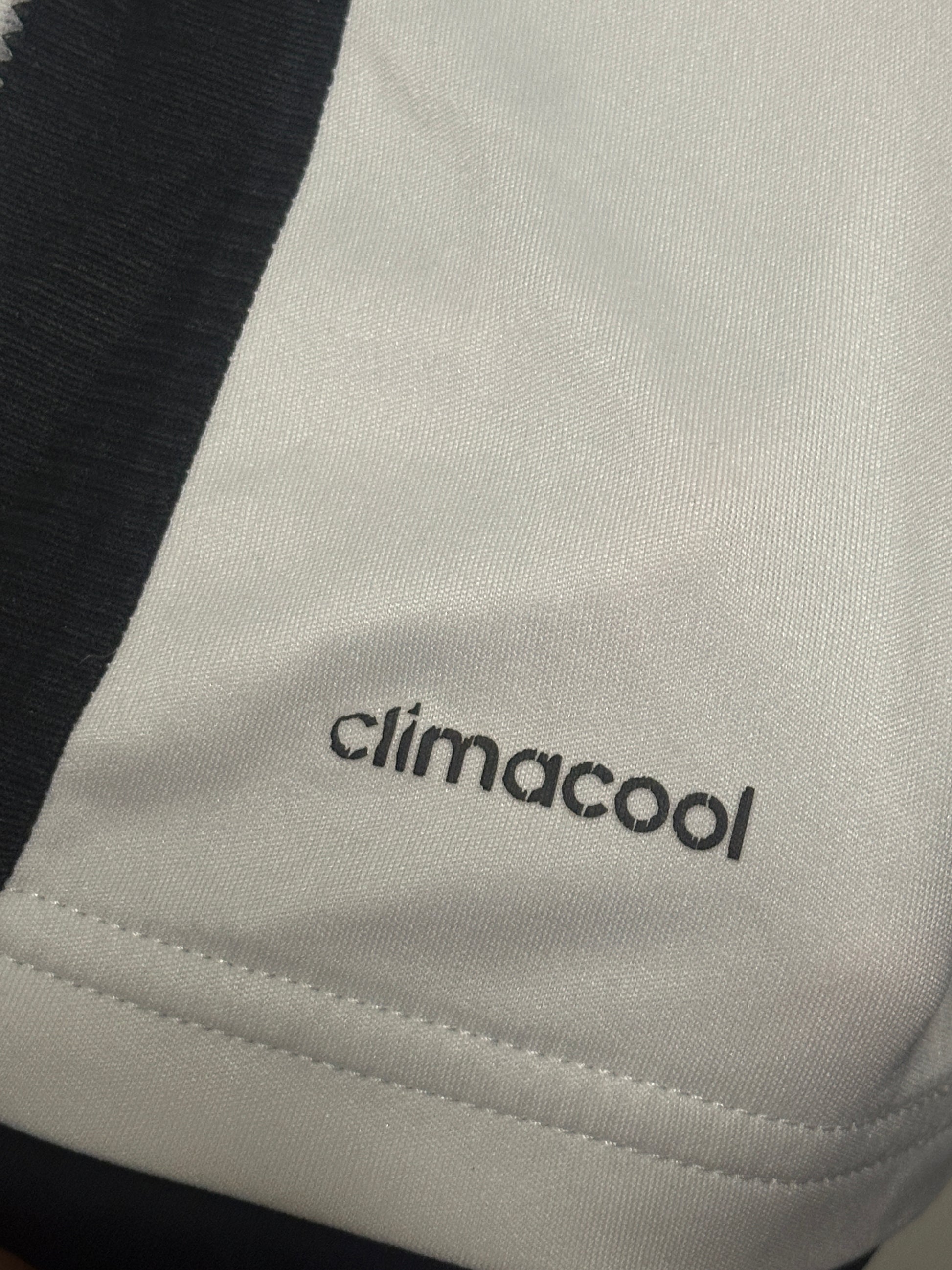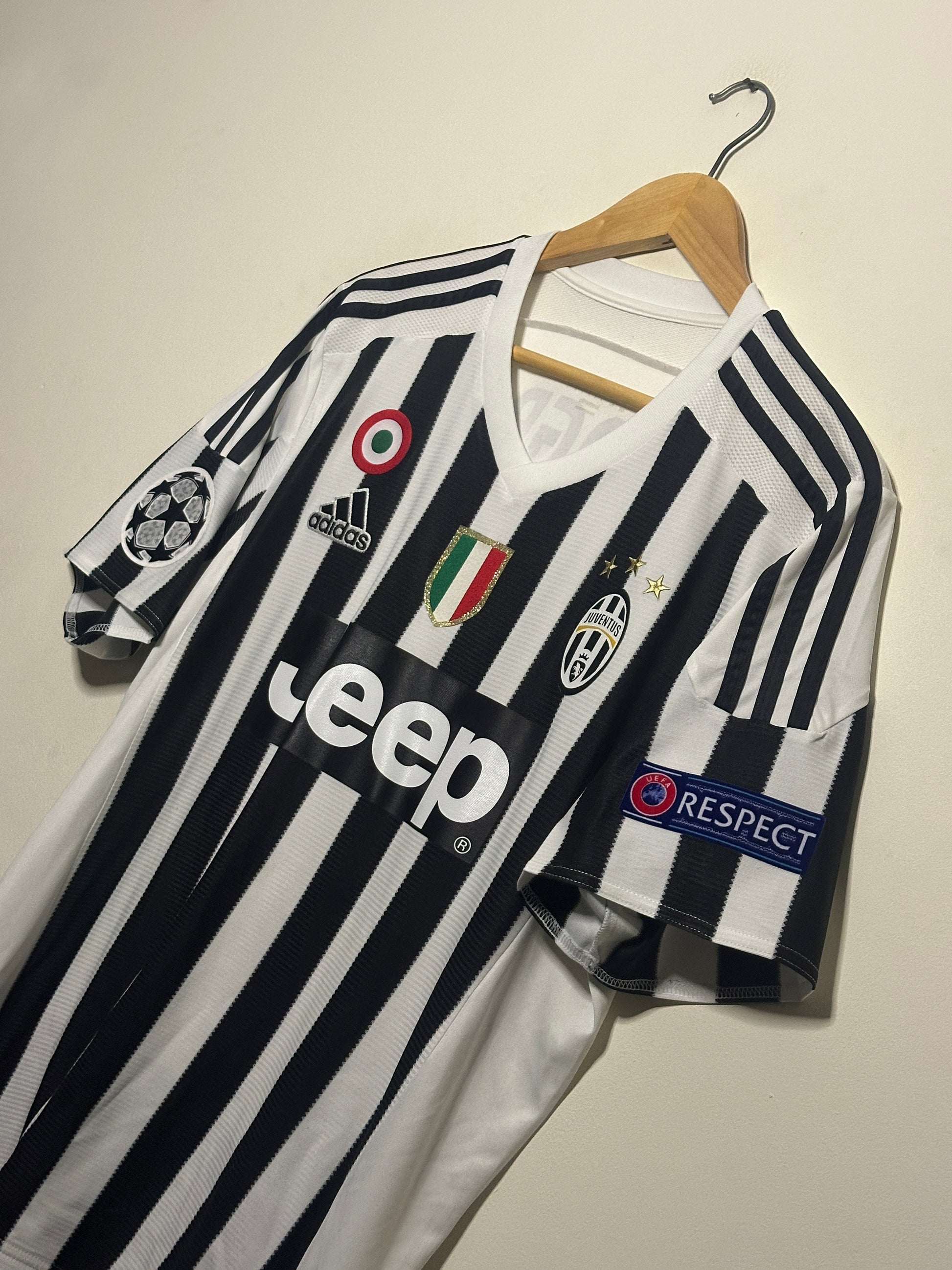 This authentic Paul Pogba Juventus FC home shirt from the 2015-16 season is in excellent condition. Featuring the iconic black and white stripes, it proudly displays the Scudetto and Coppa Italia patches awarded to Juventus that year. A must-have for collectors and fans, it reflects a historic season with Pogba's signature style on the pitch. The size Large ensures a comfortable fit, perfect for display or wear.