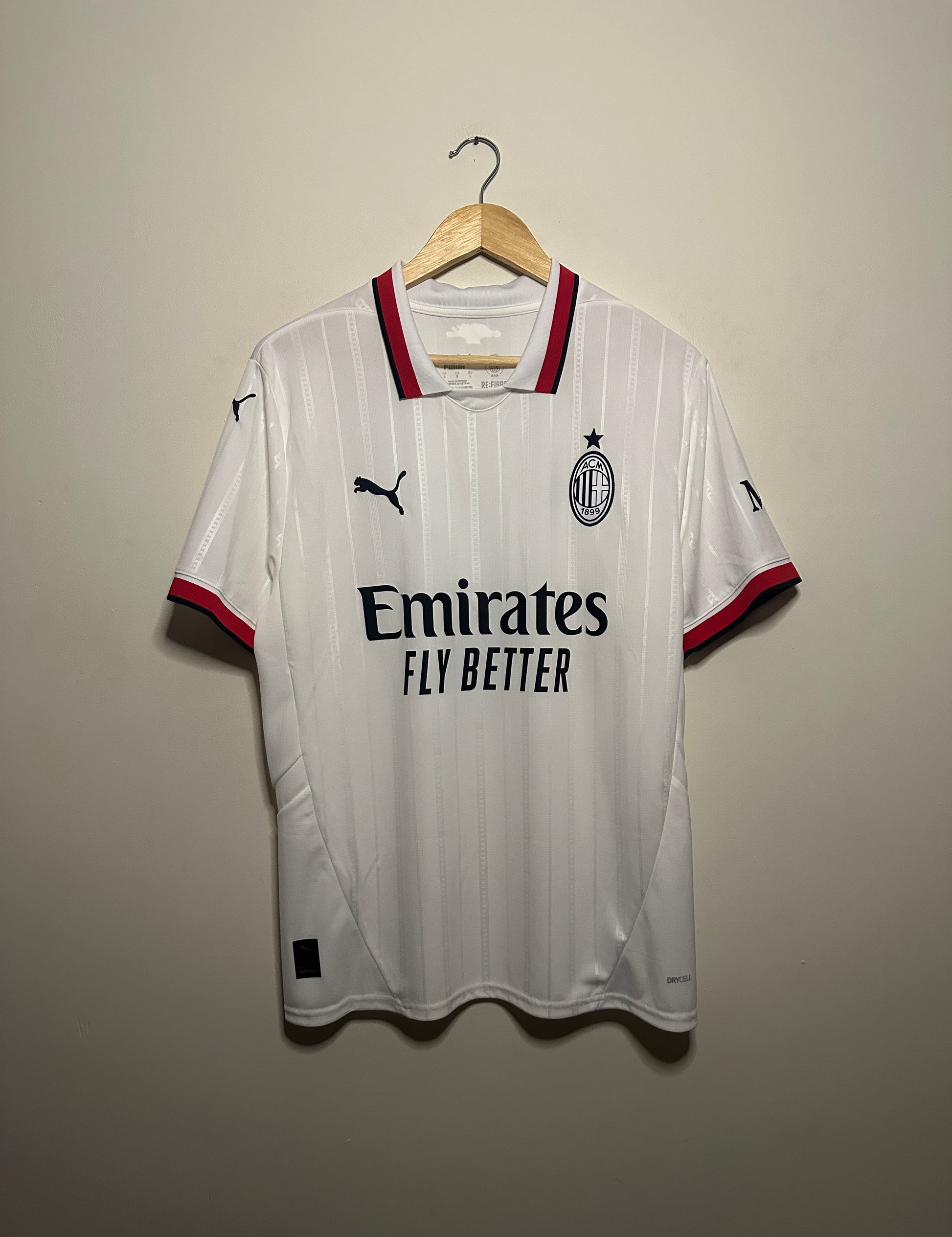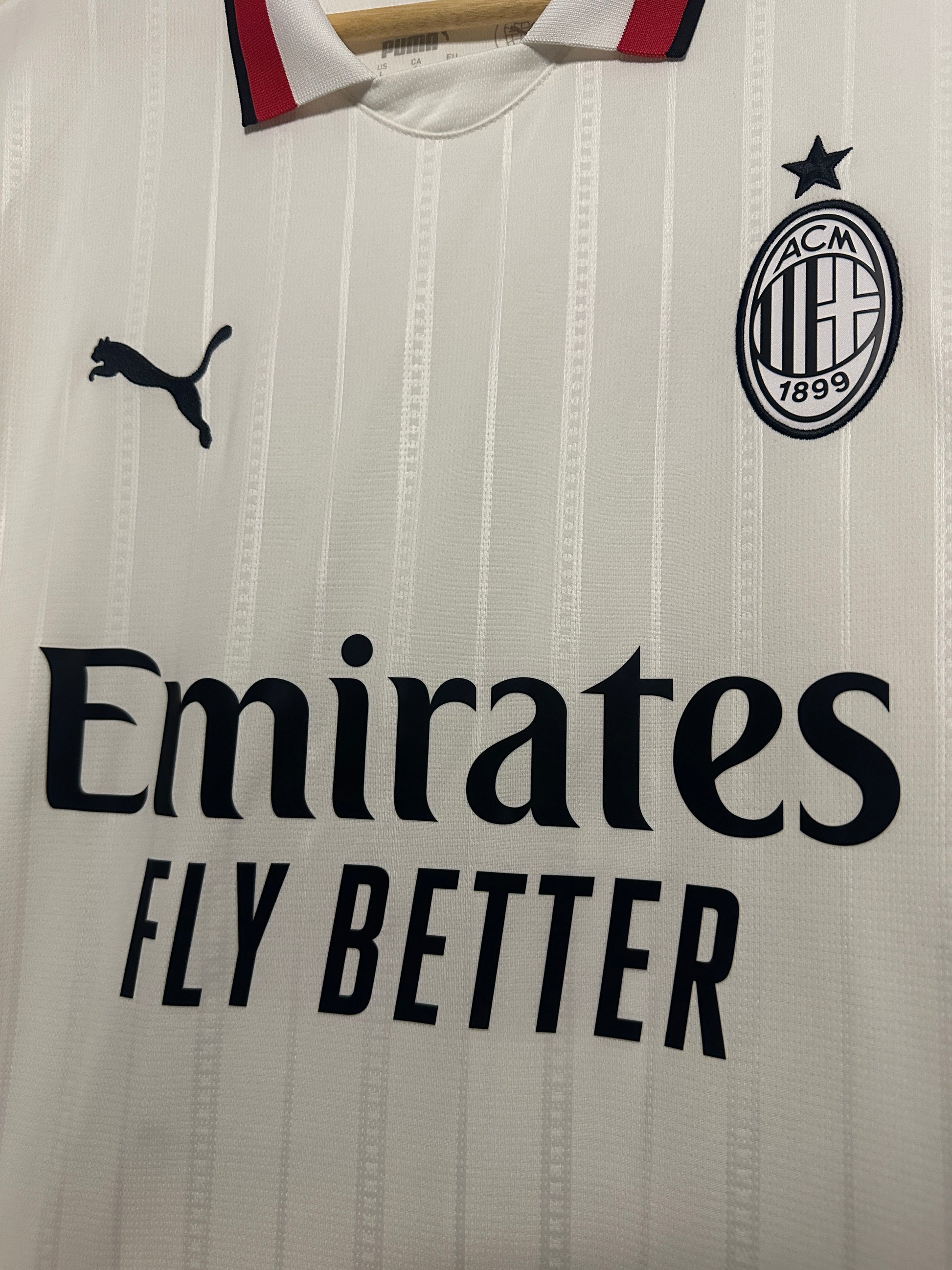 Rafa Leao's AC Milan away shirt from the 2024-25 season, crafted by Puma with meticulous attention to detail. This size L piece arrives in pristine, mint condition—brand new and unworn, complete with all the quality you'd expect from official club merchandise. A must-have for collectors and devoted Rossoneri supporters who appreciate authentic, unworn kit from one of Serie A's most exciting talents. Secure this piece of football history today.