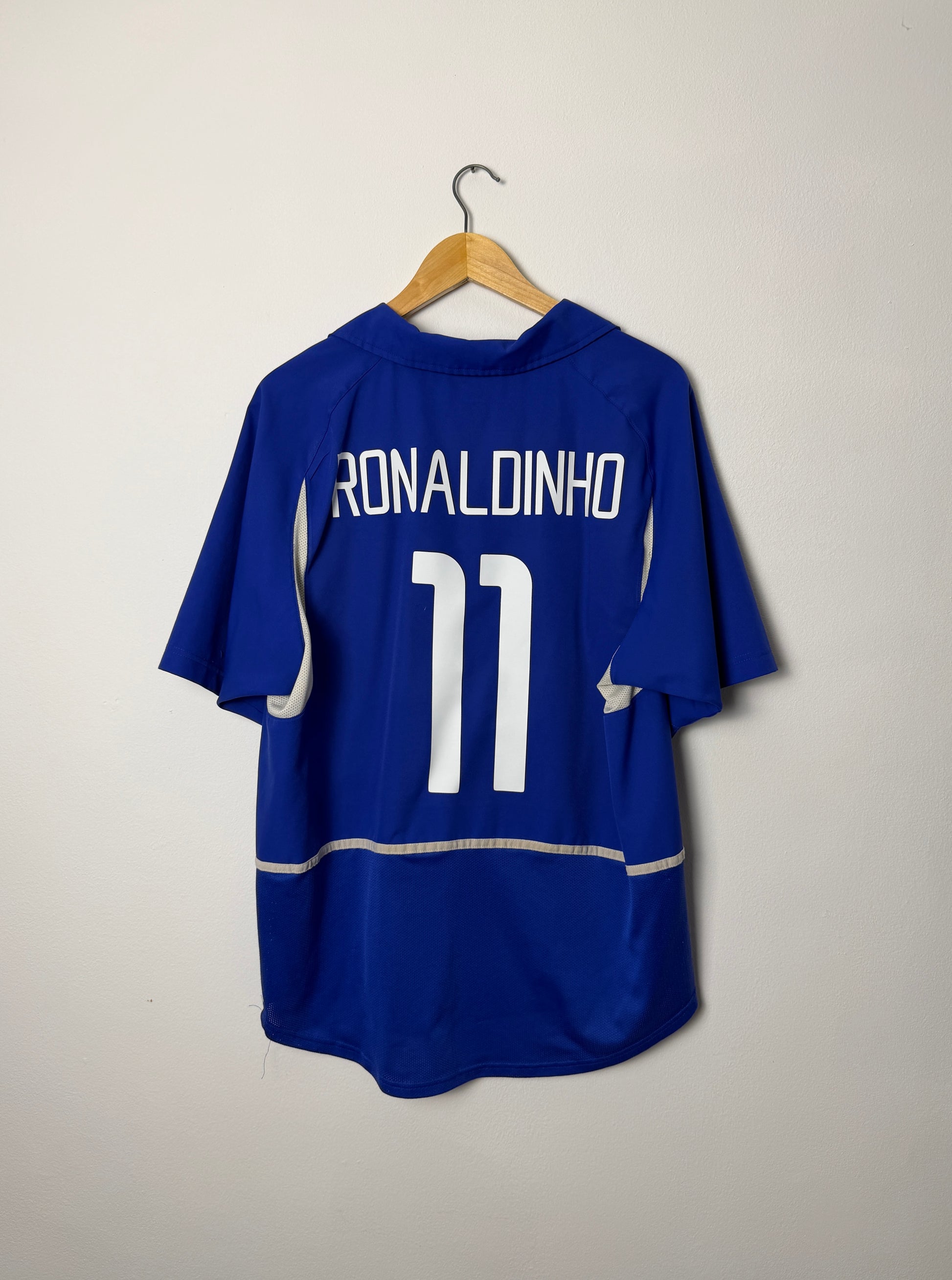 Authentic Ronaldinho Brazil 2002 away football shirt in large, crafted by Nike. This iconic vintage jersey celebrates one of football's greatest players during his prime years. In very good condition, it's a treasured piece for collectors and fans alike. The classic design captures the spirit of that legendary era, making it a meaningful addition to any football memorabilia collection.