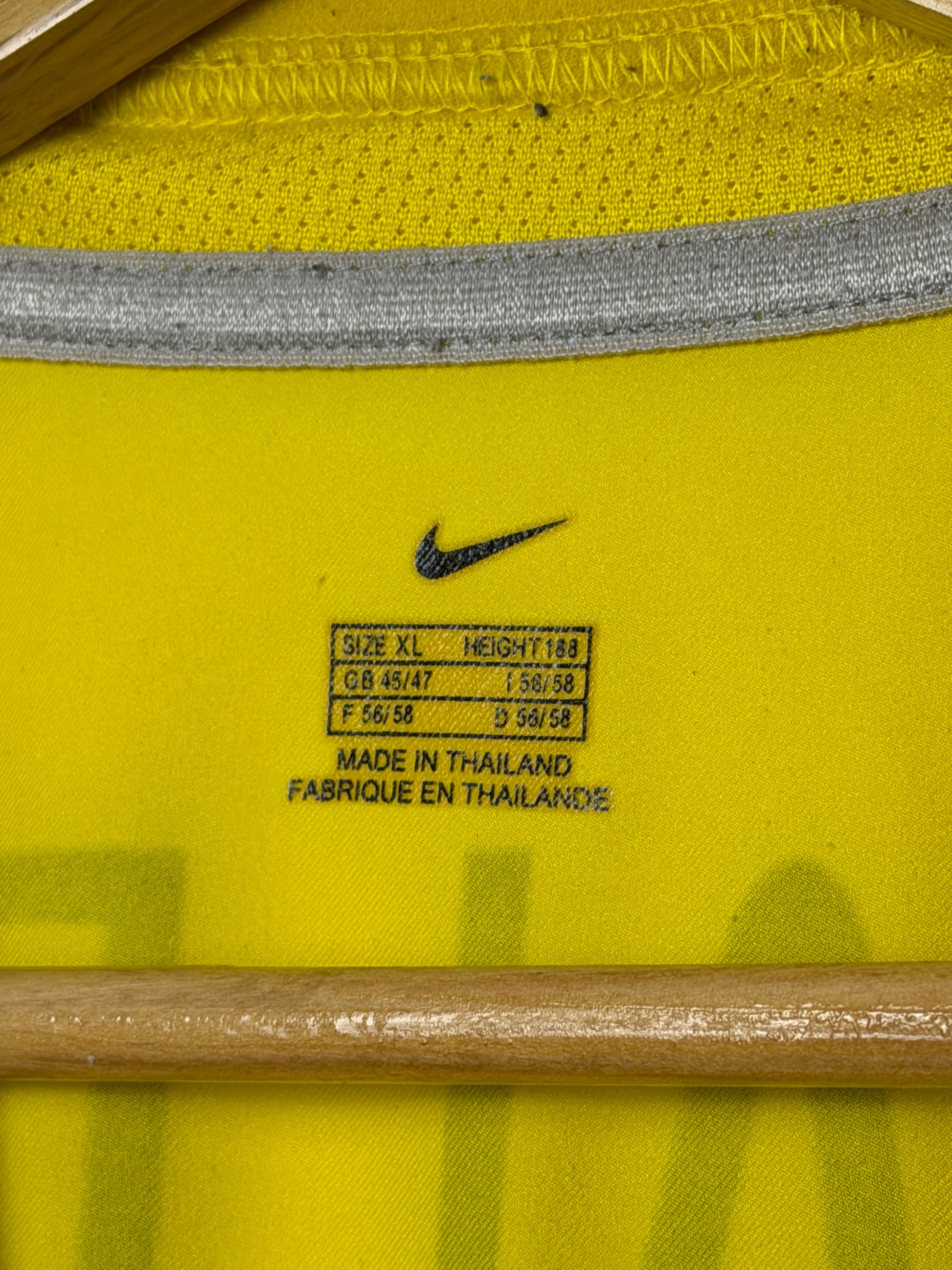 Authentic Nike Brazil 2002 World Cup home shirt featuring Ronaldo Nazario, the legendary striker who dominated that tournament. This XL vintage piece captures football history with its iconic yellow design and classic early-2000s styling. While in good overall condition, the shirt bears authentic burn marks to the rear, adding character and provenance to this collectible. Perfect for dedicated fans and vintage football shirt enthusiasts seeking genuine memorabilia from one of sport's greatest moments.