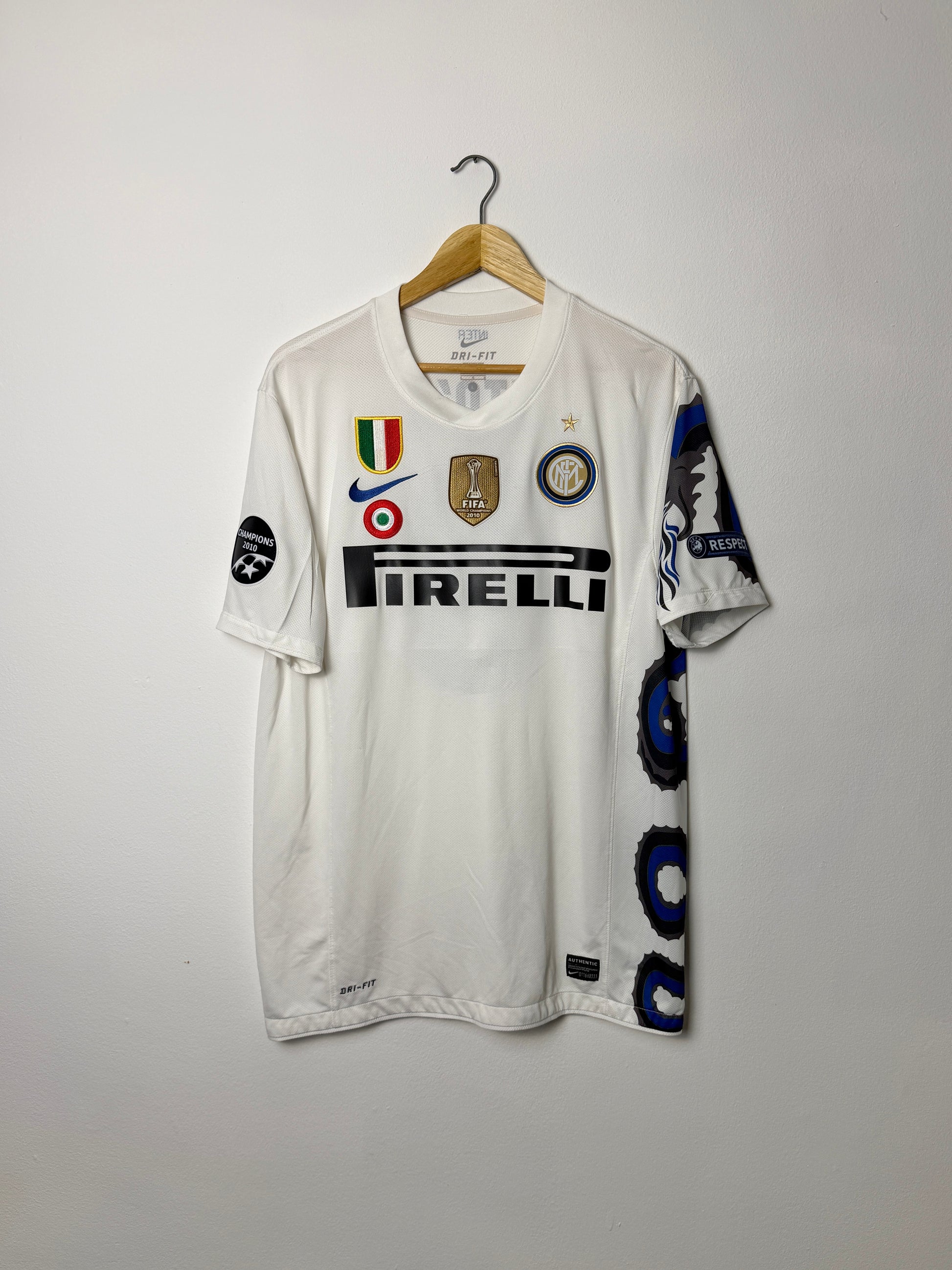 This authentic Inter Milan away shirt from the legendary 2010-11 season celebrates one of the club's greatest years. Crafted by Nike, it proudly displays the Scudetto, Coppa Italia, Champions League, and Club World Cup winner patches—a testament to Inter's historic treble achievement. In excellent condition, this vintage piece captures the glory of Samuel Eto'o's era at San Siro. A must-have for collectors and devoted Nerazzurri supporters seeking a tangible piece of European football history.