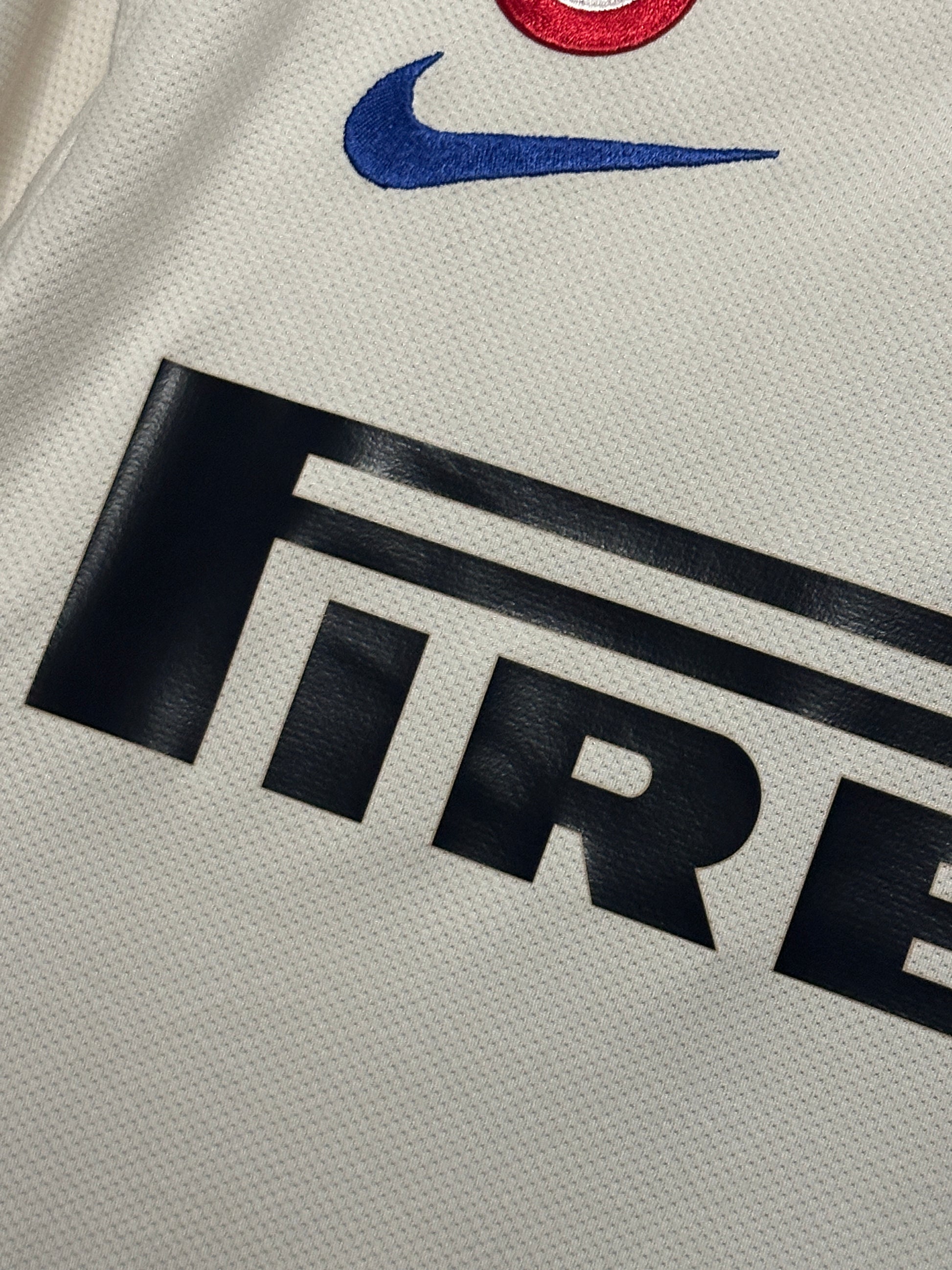 Samuel Eto'o's iconic Inter Milan away shirt from the 2010-11 season, size medium. This authentic Nike jersey captures a memorable era of European football history. The shirt is in good condition with two minor stains visible on the back, as pictured. A genuine piece for collectors and fans of the Nerazzurri, offering both sporting heritage and vintage appeal at an accessible price point.