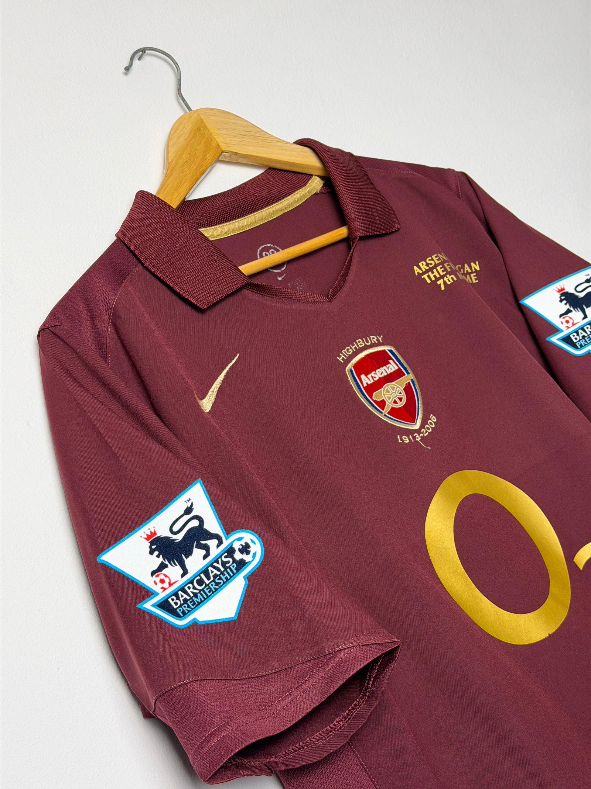 Thierry Henry's iconic final Arsenal appearance at Highbury, immortalised on this authentic 2005-06 home shirt. This legendary piece captures one of football's most poignant moments—Henry's last game for the Gunners before his move to Barcelona. In excellent condition with only minor wear to the lower 'O' on the badge, this is a treasured collectible for any Arsenal devotee. Own a tangible piece of Highbury history and celebrate the legacy of one of the club's greatest ever players.